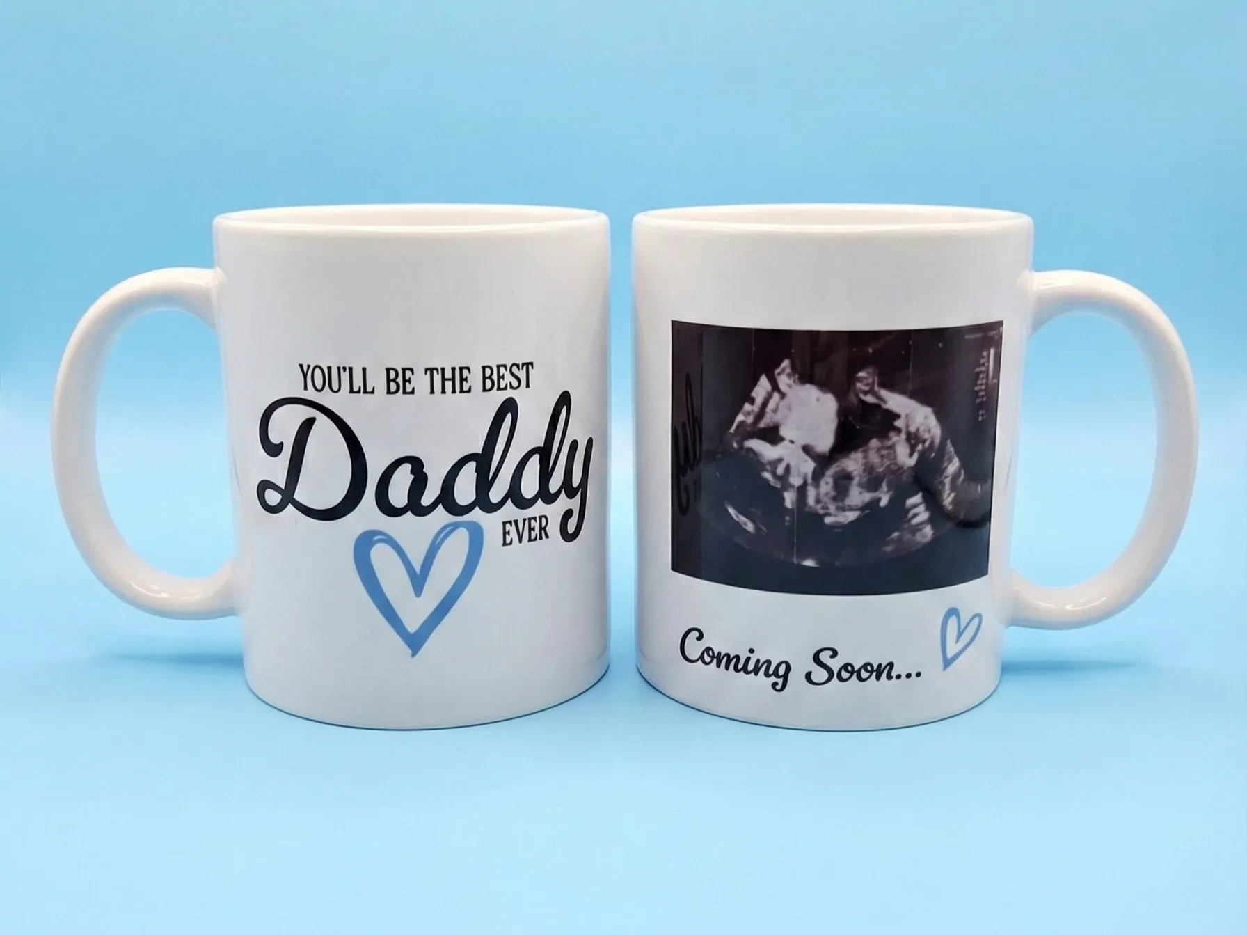 Celebrate a brand-new chapter with this sweet “Best Daddy Ever” mug – the perfect way to share your big news and make Dad feel extra special. Featuring a bold, modern design with a soft blue heart and an adorable “Coming Soon…” message alongside your chosen photo, it’s a keepsake he’ll reach for every morning.