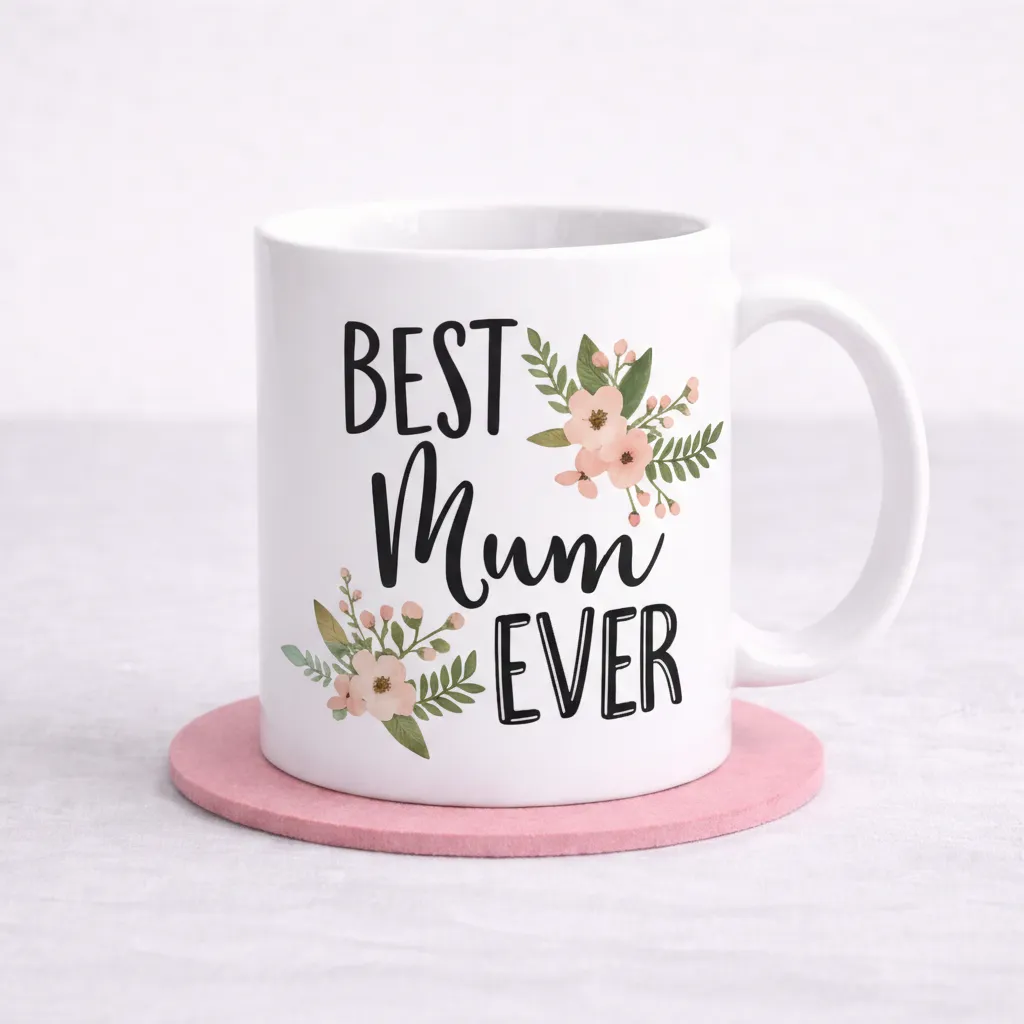 — a beautiful everyday reminder of just how loved she is. With its soft botanical details and clean,Keep it classic and heartfelt with our elegant “Best Mum Ever” floral mug modern lettering, this design is perfect for mums who love something simple, stylish, and timeless.
